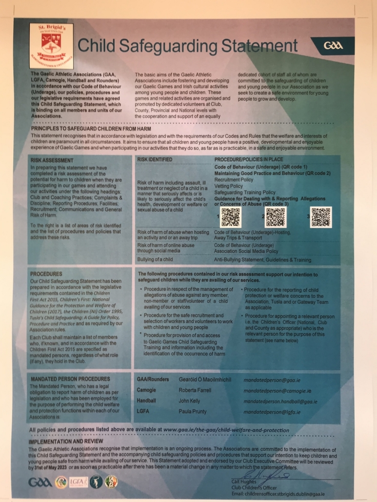 - It is important that every member of St Brigid’s GAA club familiarise themselves with this statement.
